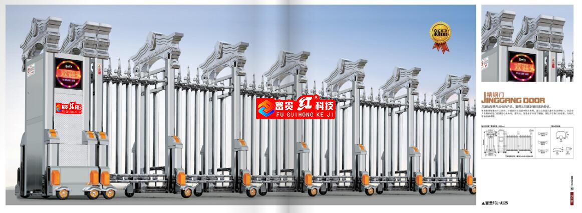 采用高强度不锈钢主料90X60mm条纹料外有50mm圆管相衬,大椭圆中柱62X22mm顺序排列着,还有上下平水25X25mm榄子加密连接,拱桥式的不锈钢头与桥墩的不锈钢弯脚连接成轮中940mm的四轮驱动,总宽1000mm的门中豪杰。